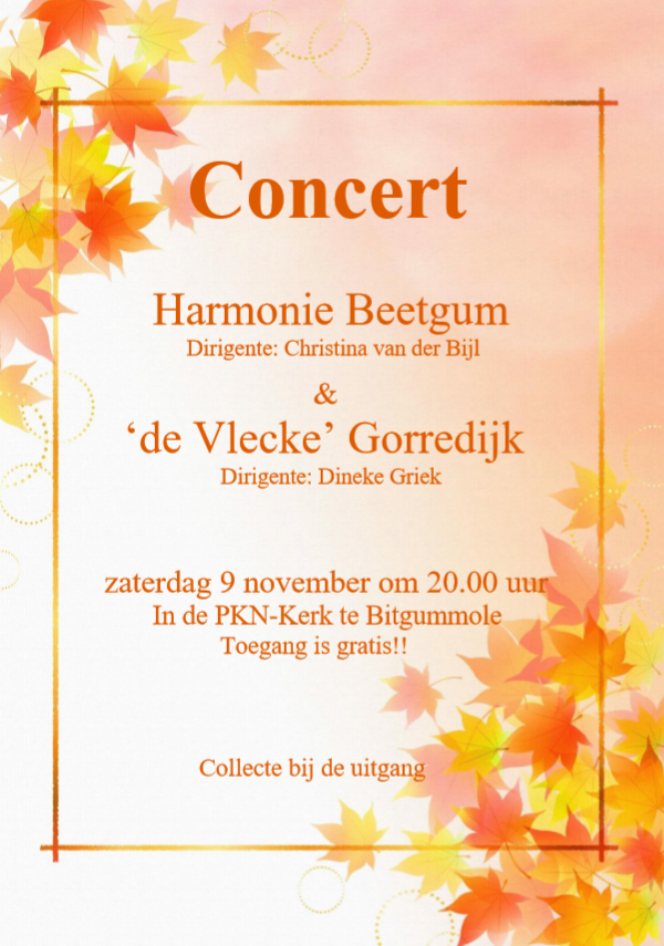 Zaterdag 9 november hebben wij samen met de Vlecke uit Gorredijk een prachtig concert mogen verzorgen. Voor de pauze speelden beide korpsen afzonderlijk. Na de pauze zaten we gezamenlijk op het podium om het publiek van een mooi repertoire te voorzien!