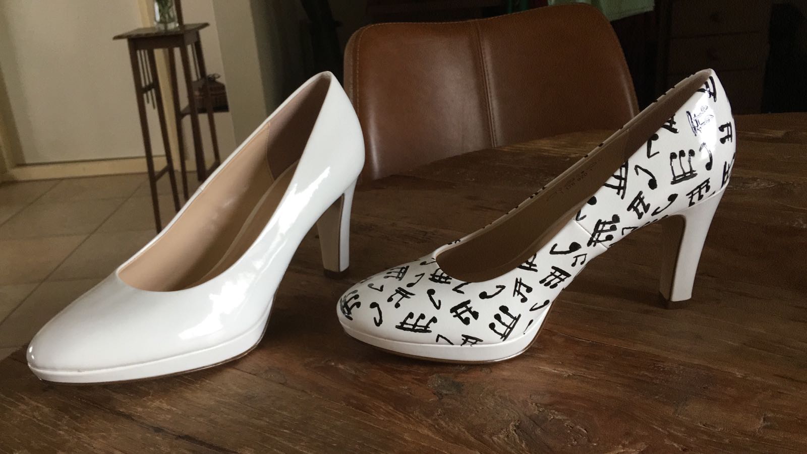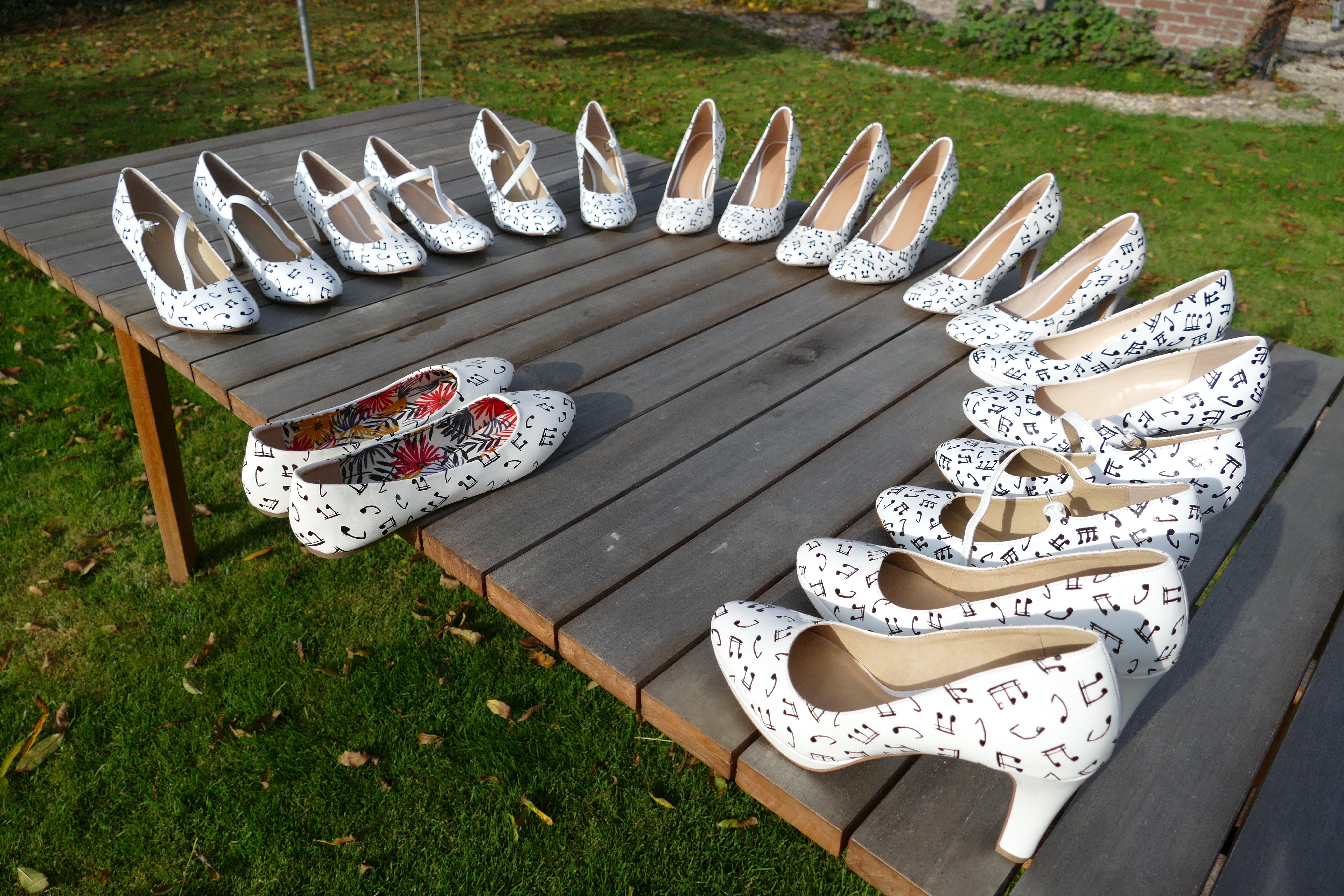 Voor het jubileumconcert in 2018 vonden we dat het tijd werd voor een nieuwe outfit. Wat konden we nou voor origineels verzinnen? Er zijn zoveel orkesten die een sjaaltje of een das hebben… Wat valt nou echt op? Eén van de leden kwam met het idee om zelfgeschilderde pumps voor de dames te maken, en zo gezegd zo gedaan! Verder hebben de dames als nieuwe outfit een witte sjaal met zwarte muzieknoten gekregen en de mannen dragen tegenwoordig een wit overhemd met een zwarte stropdas met witte muzieknoten. Spik en span dus!