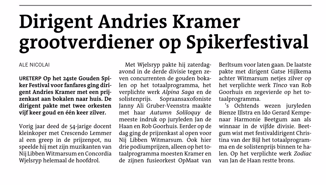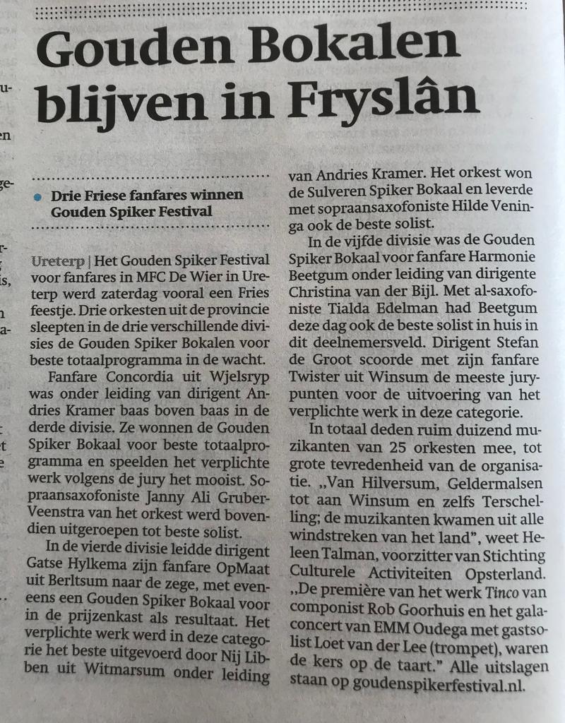 18 mei hebben wij voor het eerste meegedaan aan het Gouden Spikerfestival in Ureterp, en hoe… Tialda Edelman op altsaxofoon sleepte de eerste prijs binnen met haar solostuk. Het verplichte werk dat we moesten spelen leverde ons een derde prijs op en voor het gehele programma hebben we ook een eerste prijs binnen gesleept! Super!